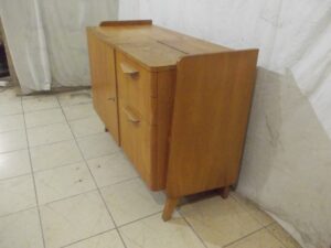 Drewniana komoda w stylu retro, projektu F. Jiraka, wyprodukowana w Czechosłowacji w latach 70. Stan jak na zdjęciach – blat do oszlifowania i pomalowania – fornir nie podniesiony . Konstrukcja do odświeżenia . wymiary – wys.- 78 , szer.- 105,5 , gł.- 47 . Koszt transportu EU paleta 250 zł. , lub odbiór osobisty . Cena 800 zł