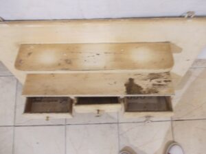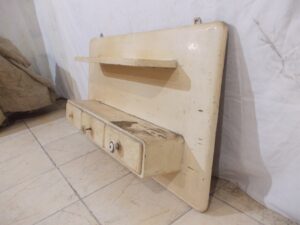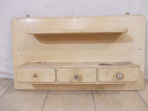 Mam do sprzedania starą wiszącą półkę z 3 szufladkami . Stan jak na zdjęciach – drewniana bez insektów , do oszlifowania i pomalowania . Wymiary 91 x 51 cm. Koszt transportu 50 zł. , lub odbiór osobisty . Cena 120 zł.