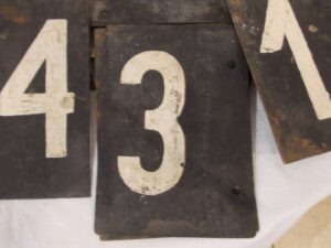 Stare industrialne numerki metalowe 14,5×10 cm.
