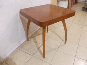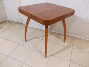 Mam do sprzedania stary Czechosłowacki stolik kawowy – pająk , projektu J.Halabala . Stan jak na zdjęciach – fornir nie podniesiony orzech , nie popękany , nie połamany , do oszlifowania i pomalowania . Wymiary – wys.- 65 , blat 65 x 65 cm. Koszt transportu 60 zł. , lub odbiór osobisty . Cena 600 zł