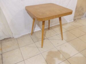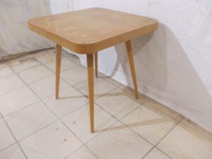 Mam do sprzedania stary Czechosłowacki stolik kawowy – pająk , projektu J.Halabala . Stan jak na zdjęciach – fornir nie podniesiony , nie popękany , nie połamany , do oszlifowania i pomalowania . Wymiary – wys.- 65 , blat 65 x 65 cm. Koszt transportu 60 zł. , lub odbiór osobisty . Cena 350 zł.