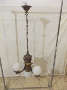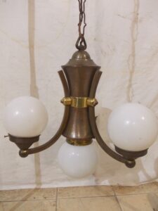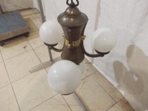 Mam do sprzedania przedwojenną lampę wiszącą art deco . Stan jak na zdjęciach – kompletna , mosiężna , na 4 żarówki , instalacja oryginalna ( raczej do wymiany ) , wysokość całkowita 100 cm. klosze szklane . Koszt transportu 50 zł. , lub odbiór osobisty . Cena 500 zł.