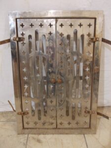 Mam do sprzedania przedwojenne drzwiczki z pieca kaflowego . Piec stał w starej kamienicy , w salonie . Stan jak na zdjęciach – nie popękane , nie pogięte , do odnowienia . Wymiar całkowity zewnętrzny – 63 x 43 cm. Koszt transportu 30 zł. , lub odbiór osobisty . Cena 150 zł.